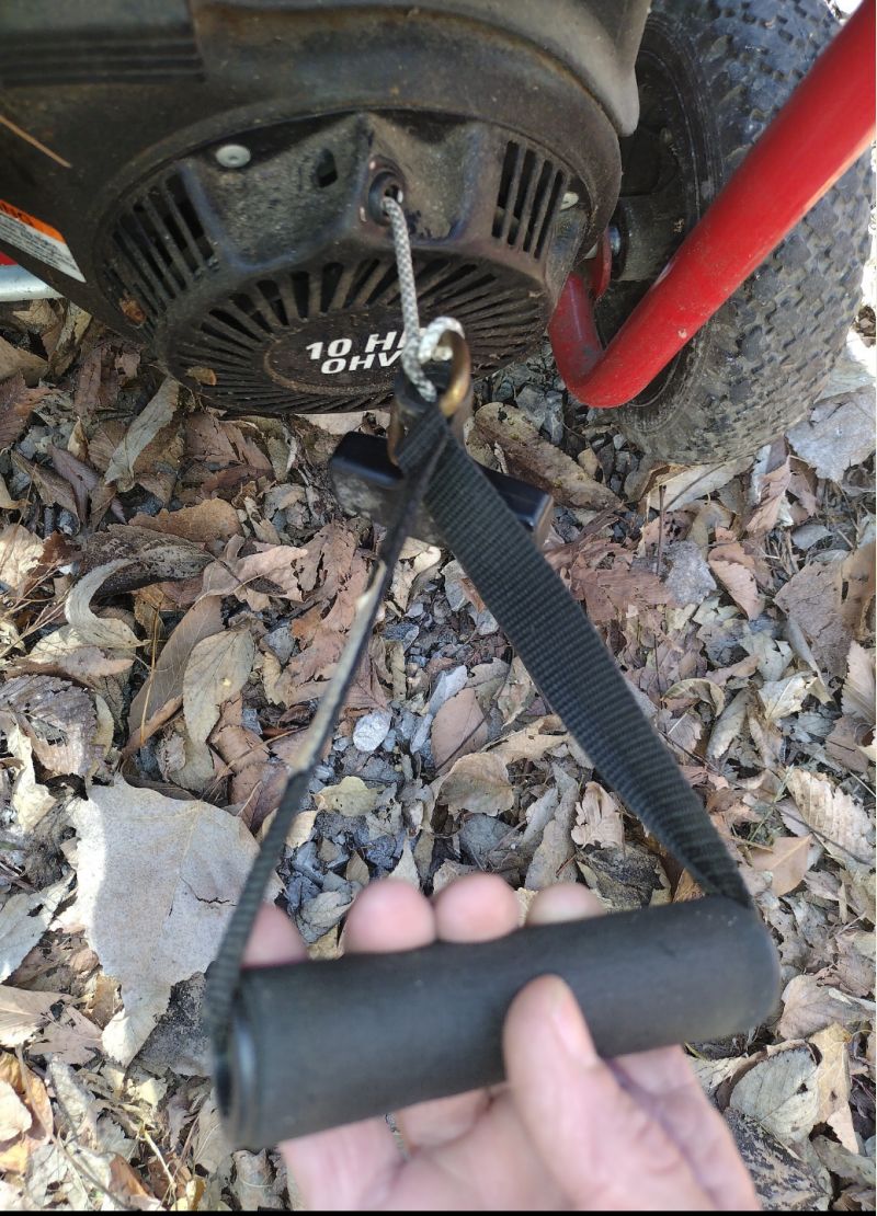 I took a leftover handle from exercise bands, and easily looped the cord thru the D ring. Now it's a lot easier on the fingers to pull start it. Its kinda like those D handles you can buy.