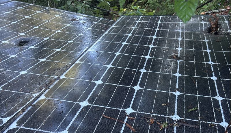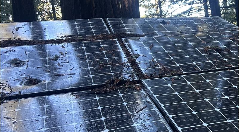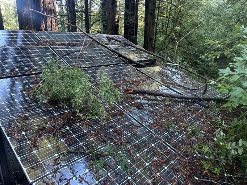 Cool. Well all not unscathed here. Went up to blow off the array. Ew, more branches through. Didn’t seem to hurt the ones from two years ago, we’ll see.