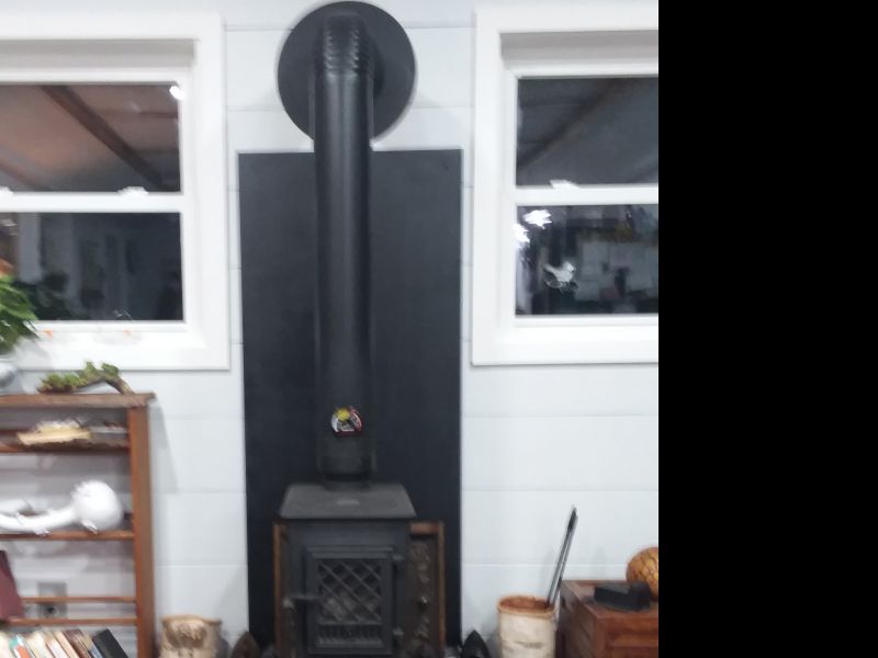 I added 1/2 inch insulation board and T1-11 with battens. I used Cabots clear stain but it came out kind of yellow. The battens are green from the lumber mill. I'll stain them later. I installed gutters and mini split. The little Jotul wood stove will run you out of the cabin with the extra insulation added. 20251103_100949.jpg