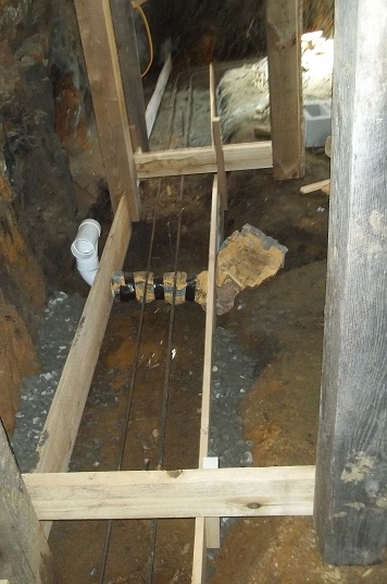 We were in deep schist on the next job. A ca.1911 hall and parlor farmhouse, the entire dry stacked foundation was a mess, the end in the pic was collapsing into a stoop height root cellar as the weak vertical rock spalled away. Next shot is the footing formed with a drain line running from outside the wall, under the footer heading towards a sump pit inside the basement. The sack wrapper is a poor relieving space maker. I also knew that footing wasn't going anywhere. No grade stakes there, the form boards are levelled to footing height. Forming is more work but easier to screed level the day of the pour. That is also the terroir of french wine country. pwf12x12.jpg