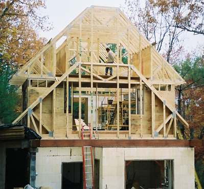 This was a cool job. The garage with MIL suite above was what we built first, attic trusses are laying in the driveway.. toy parking/shop below, apartment above. The dog in the driveway was one of the best we've ever had. Mrs client lived there as soon as we could get her in, for the duration of the main build. 2nd shot you can see the shed dormer in the MIL/garage, there was a matching shed dormer on the other side of the ridge, we are starting to lift the timberframe main house in the background.