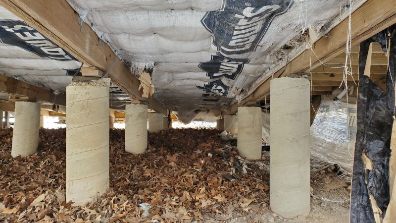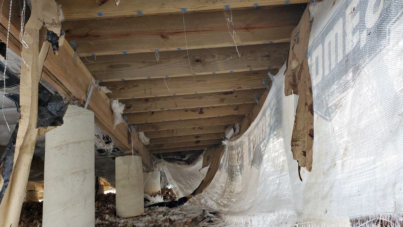 When our cabin originally went up the floor had batting insulation put under the floor and was sealed underneath with vapor barrier that wrapped up and around the girders and was nailed in. Nice and tidy, clean look but now almost 15 years later the vapor barrier has weathered and a combination of wind and critters has started to pull it down and get at the insulation. Some of it has been displaced making for some cold spots on the floor.