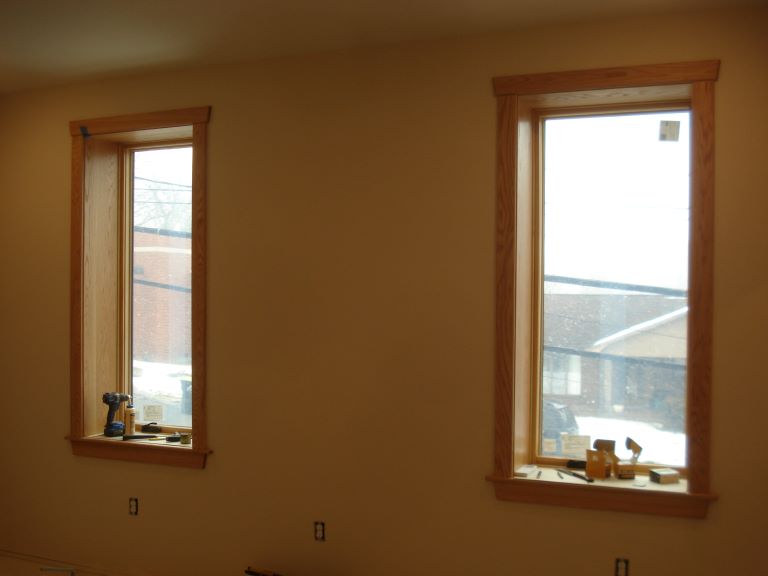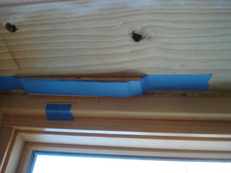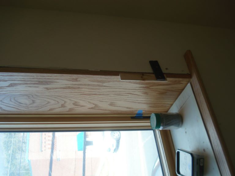 The windows at the job are in a wall that is a good bit thicker than the jambs so I had to make extension jambs before trimming them out. This is just one way to align what carpenters call E jambs with the window jambs. I used biscuits, putting tape on the window jamb and e-jamb so I could make alignment marks for the tool. I taped shims to the framing to align the tool with the window jamb. Then the next problem is how to clamp the e-jamb in place while the glue dries. I did that by drilling holes in some 1/4" thick steel strap and screwing it to the framing with a piece of shim as needed to concentrate the force on the e-jamb. Then I could trim nail the face trim on, putty the holes and apply the final coat of Waterlox finish. This is from trees I harvested, sawed, dried and processed. Biscuit.JPG
