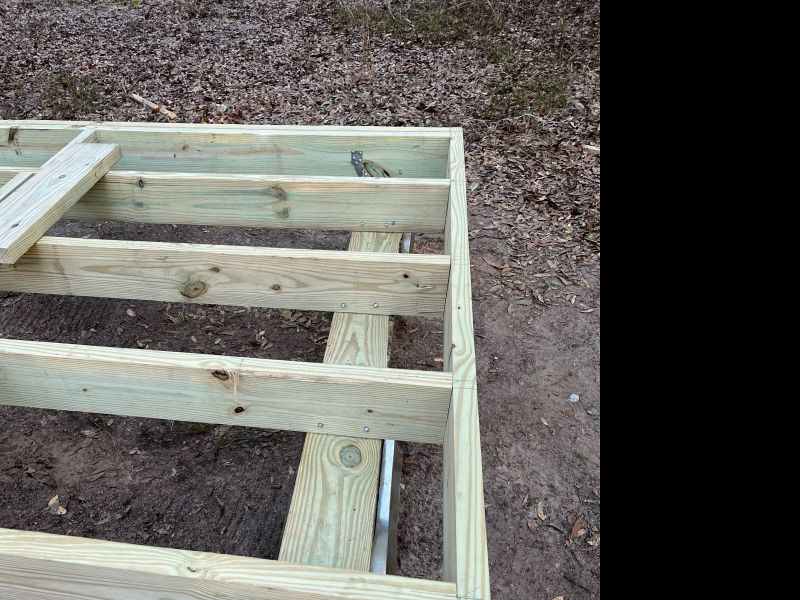 Joist framing is 2x6 with blocking. I doubled up the end joist, as I am planning to used a ridge beam. I should have added double rim joist but did not think about it until after the fact. I used rafter ties and toe nailed the joists to the 6x6s. In the corners, I anchored the 6x6 posts with 5 foot tposts, each secured with two 4” structural screws.