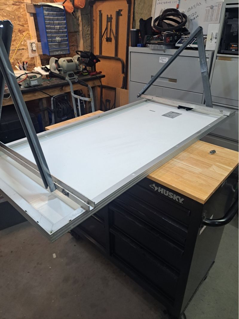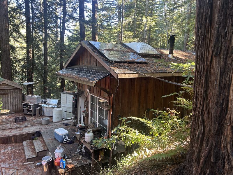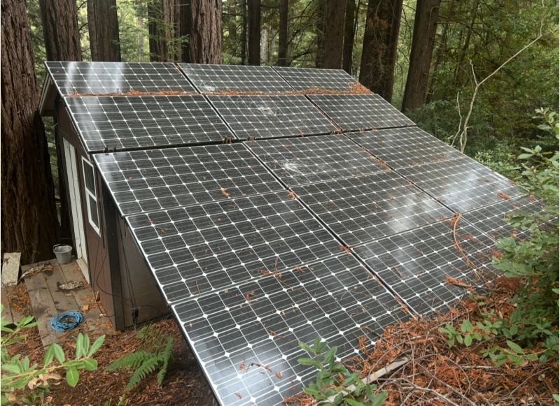 Center of roof to the ground!  Kidding, that’s my main array on the storage shed.  Got a few more on the cabin roof, just enough room to walk down the top center, no eve overhang, not that it would matter. Porch overhang is just panels, just wood frame under.