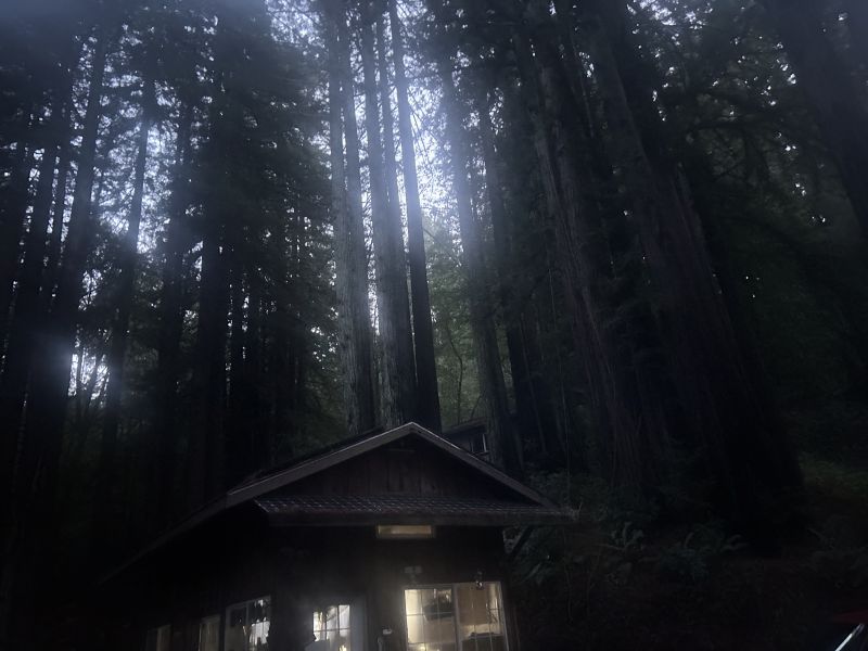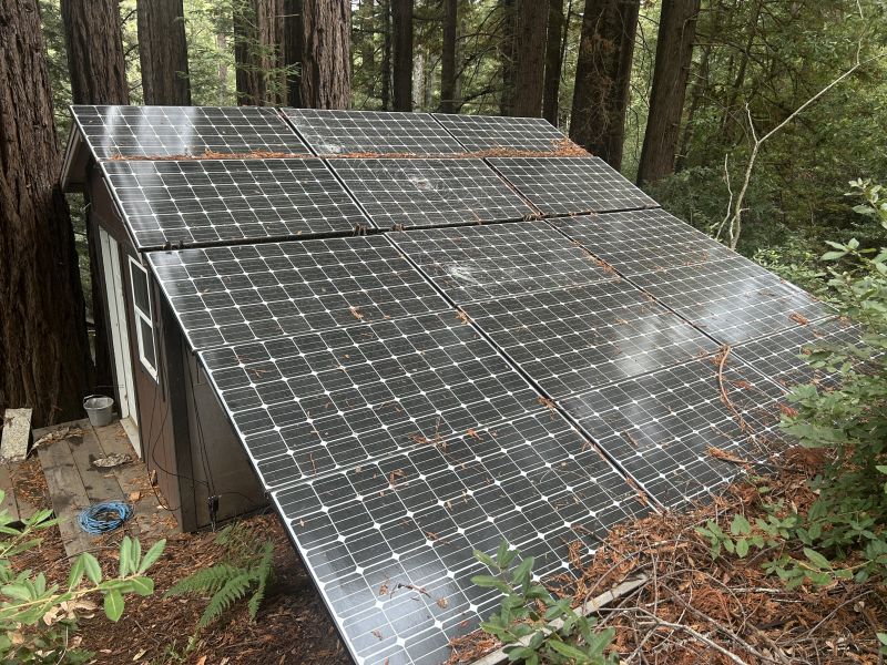 Here you can see the guest shack just behind the cabin roof, where the array is on the other sides. The sun rises to the back side and travels above the hillside around the other side. Between the trees and hillside it’s a battle. It’s a bit better down the hill at the flat by my shop but not much. Forest everywhere. IMG_5977.jpeg