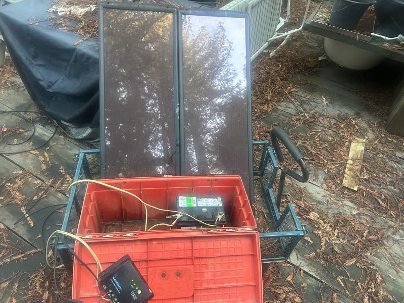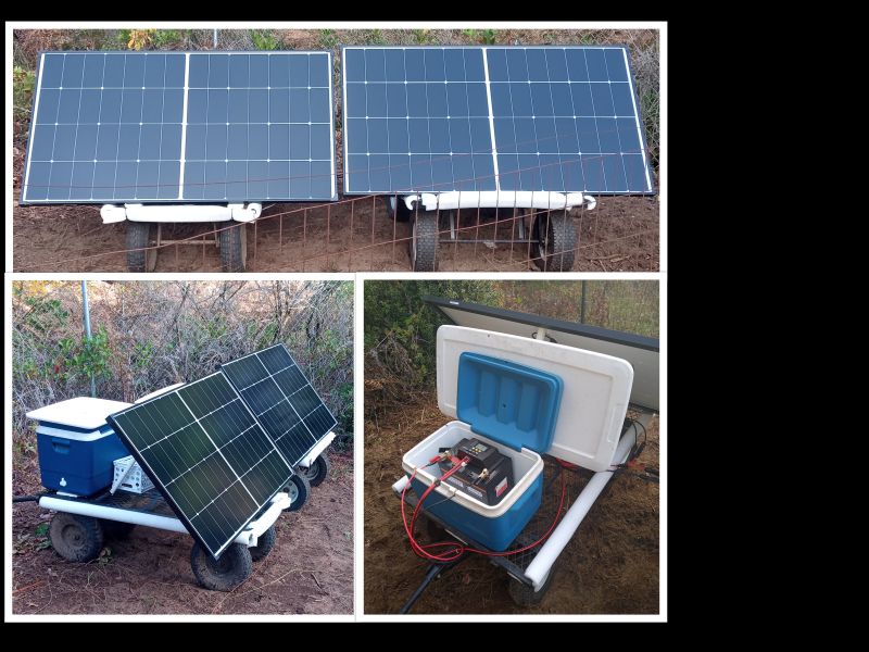 paulz, You and I have the same problem...trees. My main aray is 2000 watts and fixed position, so I grab what I can when the sky is right but on decent days there are places where you can get a couple hours of exposure which also changes with the season so, I figured why not go where the exposure is so I hinged a 300 watt panel onto a garden wagon, with old cooler for weatherproof battery and charge controller storage with option to charge in parallel and presto, can charge two batteries individually or one in parallel and if a storm is coming just lay the panels flat, so far so good!