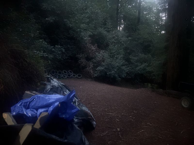 I blow them off once a week. Right now everything is covered in redwood neeedles, comes down like rain. That driveway is normally black road base. Angled any steeper and the hill would block.