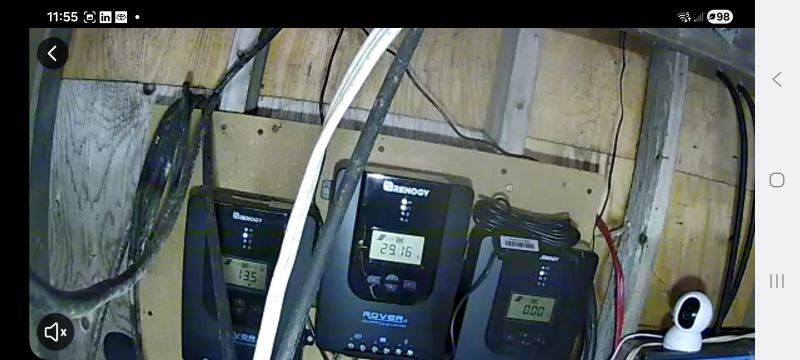 Hi Folks Just wanted to put this out there. More than pleased with the recent output of my 20 year old panels. Three 135 watt panels in series for a possible 405 watts. The other day 13.5 volts, controller on the left, 29.16 amps, center controller, for a total of 394 watts. Not to bad I think. FYI the controller on the right is for one of the panels under 2 feet of snow.
