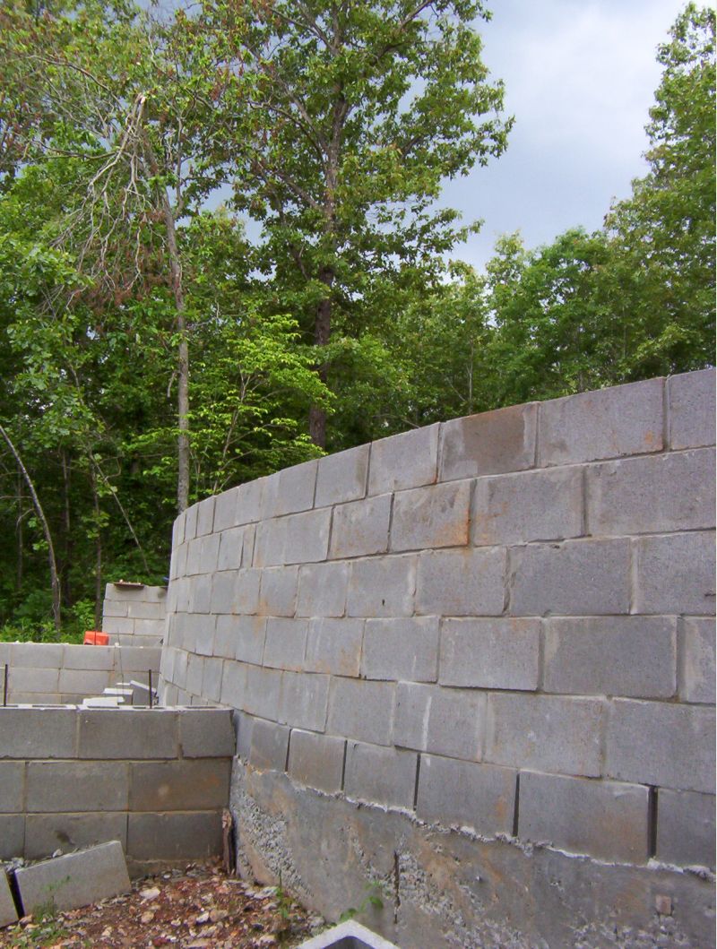We trenched and boxed in a foundation for the wall, added rebar and filled with cement. We left long rebar runners out of the footer and stacked the blocks over those. Before we capped it we back-filled many of the voids with more cement. That was 18 years ago, the wall did develop 1 crack in it but it is stable, hasn't moved in many years. Once done we planted rye grass in the area to help with erosion, a nice grassy piece of yard at this point. 100_3816.JPG