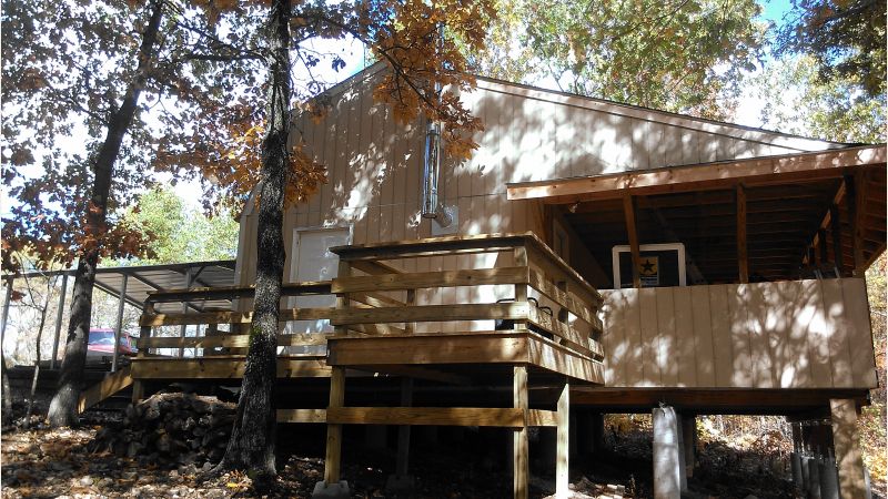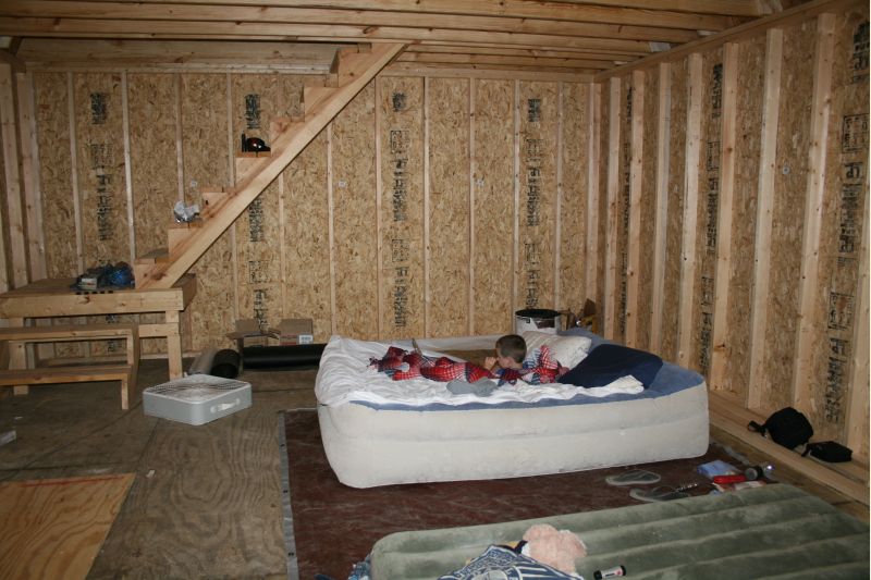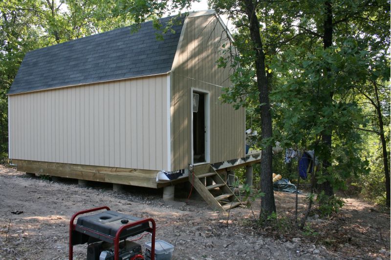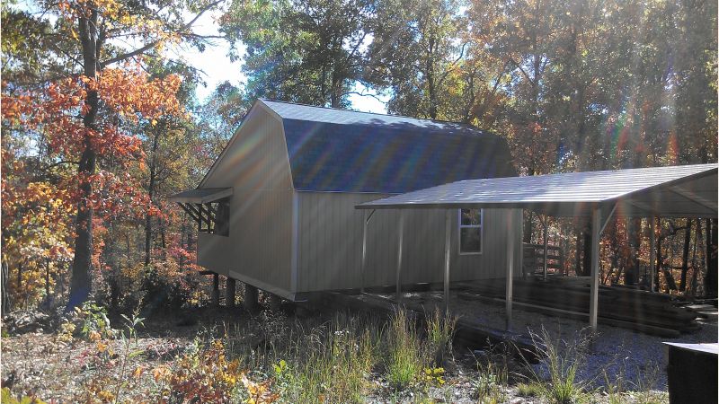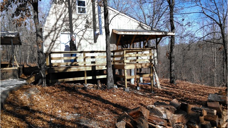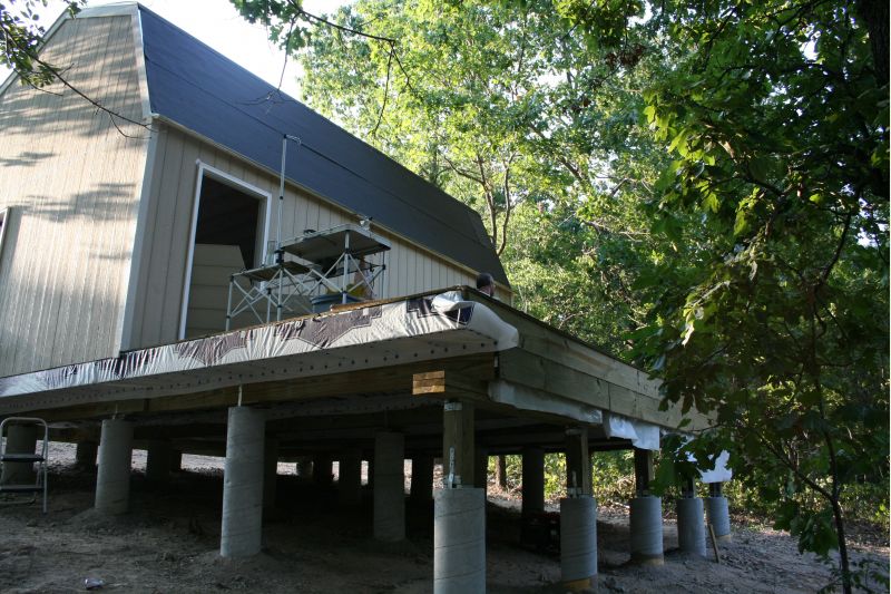 Fast forward 4 years, we had continued to tent camp on the land during this time but we had a horrible winter storm blow through the year before forcing us to abandon ship. Never again, the cabin build began. We built the foundation from 100% treated lumber to make sure there was never any rot. Using a gas powered auger we set 25 cement piers in the side of the hill. We put up a 24'x28' deck that would be home to a 24'x16' gambrel 2 story barn. Every joint had liquid nails plus deck screws. That was the foundation for the cabin. We ordered it from the local Lowes, their crew stood it up.