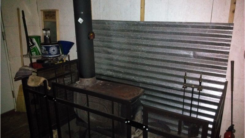 I made the hearth by laying down cement pavers, then pieces of broken pavers to create an air gap, then a single piece of cement board and another full layer of pavers for the base. Behind the stove was cement board on the wall, then 1"x1" wood slats to create an air gap and that was finished over with corrugated tin. The back was purely functional, nothing fancy at all.