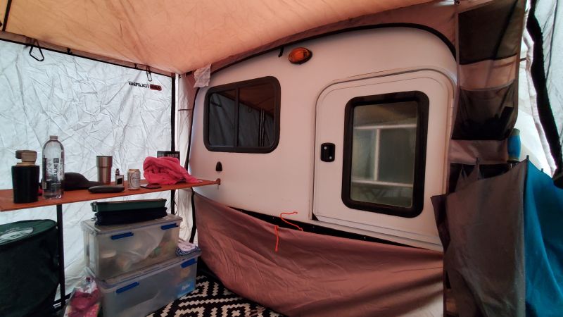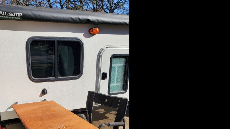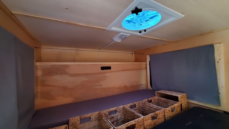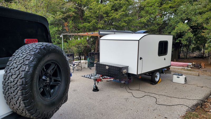 It's 100% custom 1 of a kind, we've put thousands of miles on it and camped in multiple states. It has been a super fun project. I can't say it's done because I have lots of ideas for additions I wanna make. The outside is covered in PMF or poor man's fiberglass. It's 7lb cotton duck canvas glued down with TB II and painted with an exterior latex paint. The outside will never check. There is a full queen bed inside, heating and air conditioning, storage etc. Powered with a 100 ah lithium battery with shunt and can be charged with shore, generator, or it has 200 watts of solar. I planned, designed, and built from scratch though I did buy RV doors, windows, hatches etc. It's fully wired for DC or AC and has an on board 750 watt inverter.